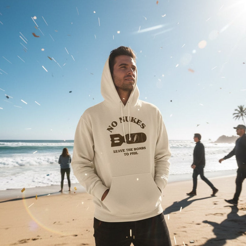 Same cheeky message, extra cozy layer. The front features “NO NUKES” arched over a vintage-style bomb with a lightning bolt and “LEAVE THE BOMBS TO PHIL” below. Clean, retro, and built for cool nights at the show or on the couch.