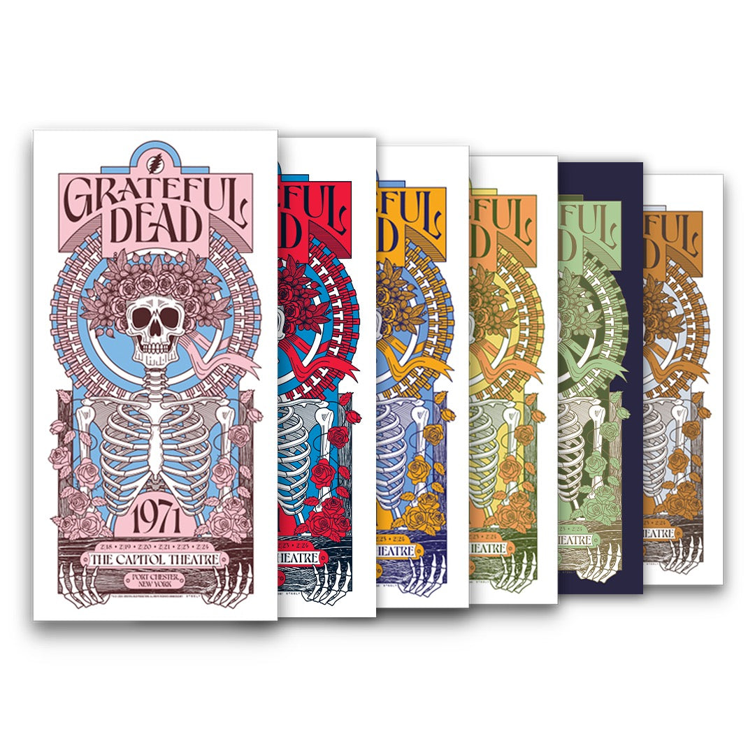 Complete six-poster set (V1–V6) commemorating the Grateful Dead’s six-show run at The Capitol Theatre in February 1971, illustrated by Brian Steely. Includes all six colorways.